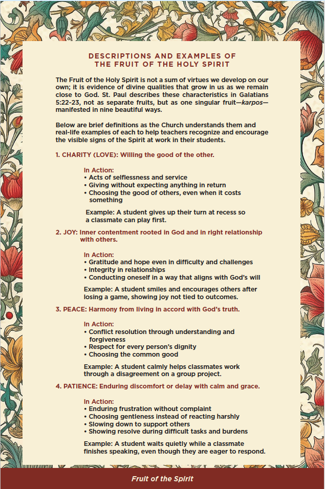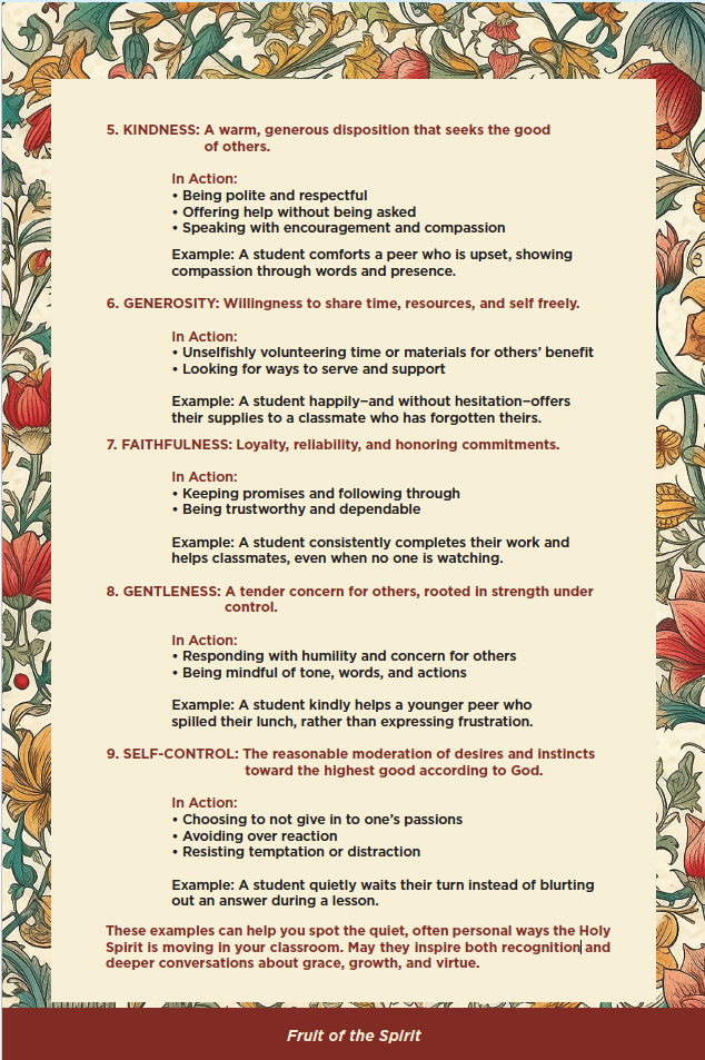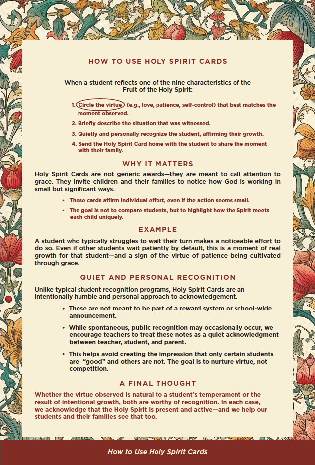 Whether the virtue observed is natural to a student’s temperament or the result of intentional growth, both are worthy of recognition. In each case, we acknowledge that the Holy Spirit is present and active—and we help our students and their families see that too.