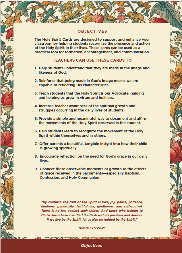 A spiral-bound set of 50 Holy Spirit Cards designed to support and enhance your classroom by helping students recognize the presence and action of the Holy Spirit in their lives. These beautiful cards can be used as a practical tool for formation, encouragement, and communication.