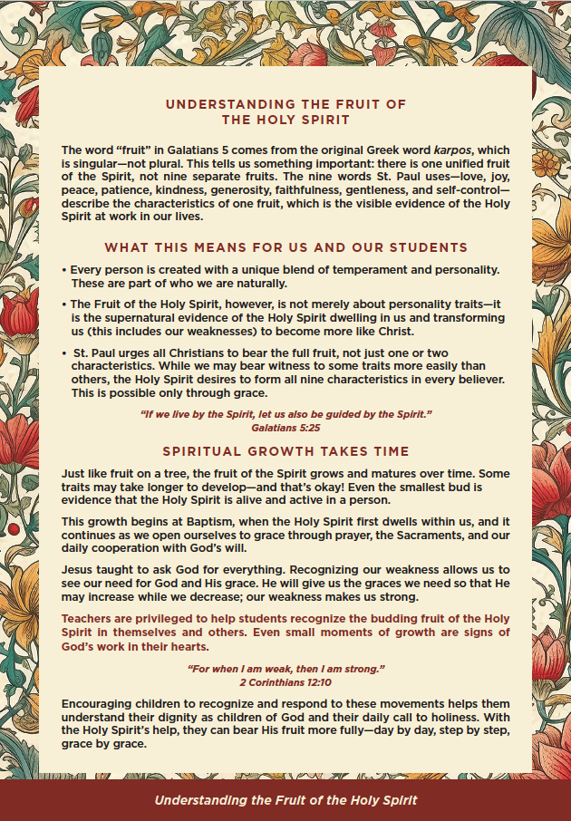 Encouraging children to recognize and respond to these movements helps them understand their dignity as children of God and their daily call to holiness. With the Holy Spirit’s help, they can bear His fruit more fully—day by day, step by step, grace by grace.