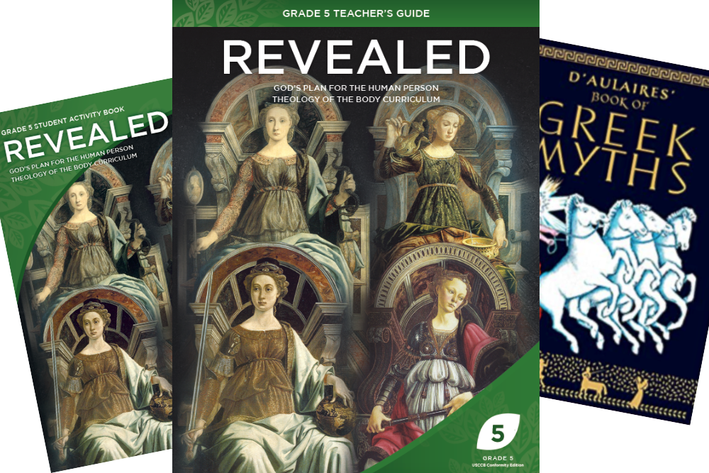 NEW USCCB Conformity Edition of our REVEALED Grade 5 Theology of the Body Curriculum. Literature and scripture-based for fifth graders to discover Theology of the Body and Christian Family Life truths. Non-consumable curriculum kit includes 3 items: D’Aulaires’ Book of Greek Myths comprehensive Fifth Grade Teacher’s Guide which contains an Original Nakedness (a pure gaze viewing one another in full dignity as body-soul composites) Scripture Study and Salvation History Timeline for exploring scripture from your classroom or family Bible, and one REVEALED Grade 5 Student Activity Book (consumable).